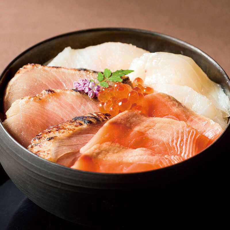 北海道産のサーモン、ぶり、ひらめ、いくらを、根昆布と鮭の魚醤のたれに漬け込みました。そのままでも、ご飯にのせても楽しめる海鮮漬です。