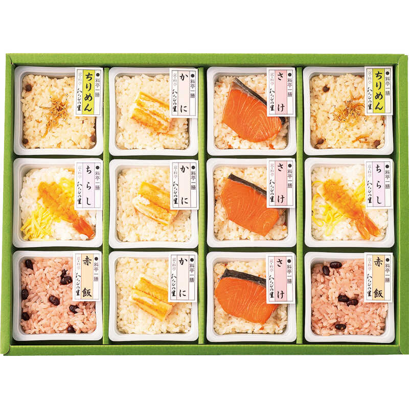- かにめし・鮭ごはん(各90g)×各3、ちりめんごはん・ちらし寿司・赤飯(各90g)×各2
