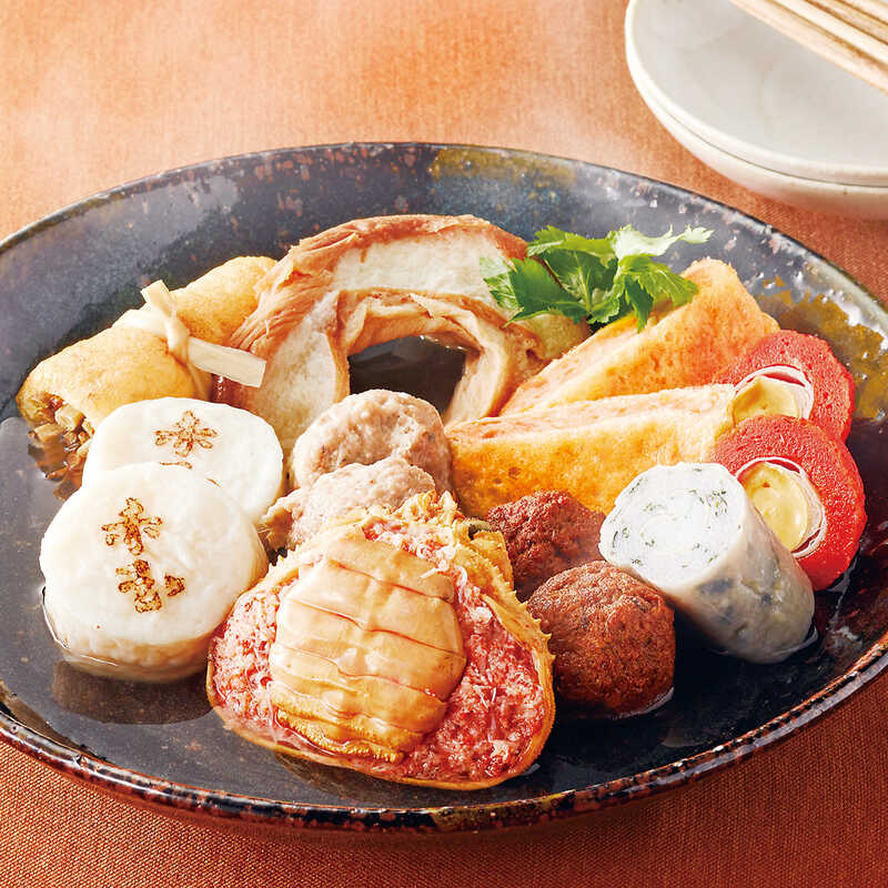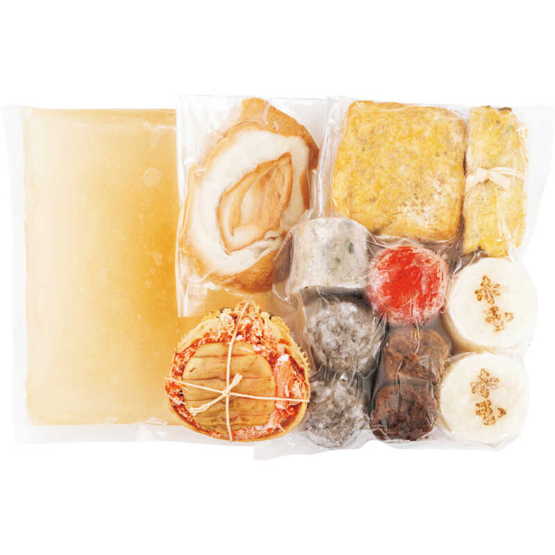 - にぎすつみれ・海老しんじょう・肉団子×各2、車麩・肉いなり・赤玉ばくだん・信田巻・金時草湯葉巻・カニ面×各1、出汁(500mL)