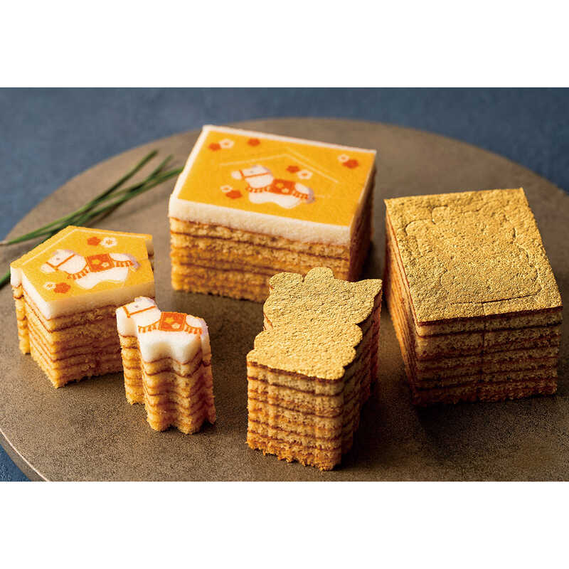 2026年の干支「午」の絵馬と、金箔をあしらったまねきねこ。どちらもシルエットに沿って“型抜き”が楽しめるバウムクーヘンです。