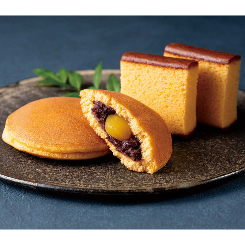 しっとりなめらかで卵のコクを感じる特選カステラ。丸ごと1粒の栗を柔らかな皮で挟んだ栗どら。職人が丁寧に焼きあげた美味セット。