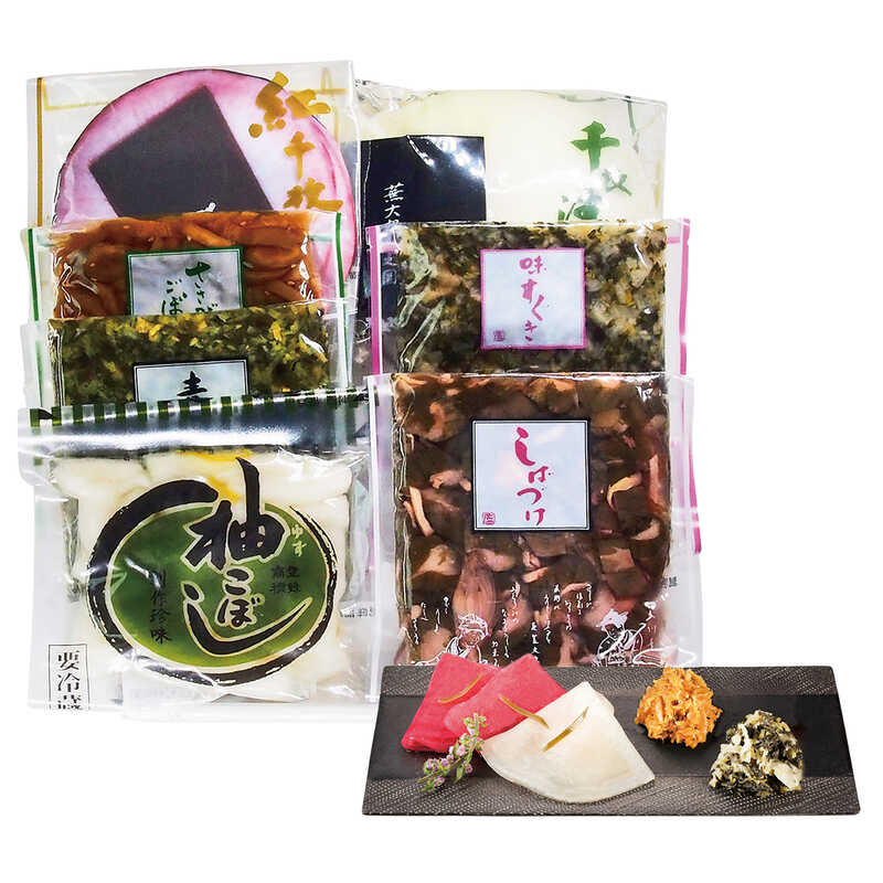 千枚漬・柚こぼし・紅千枚(各100g)、ささがきごぼう(100g)、しばづけ・味すぐき・青しそ(各90g)×各1