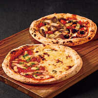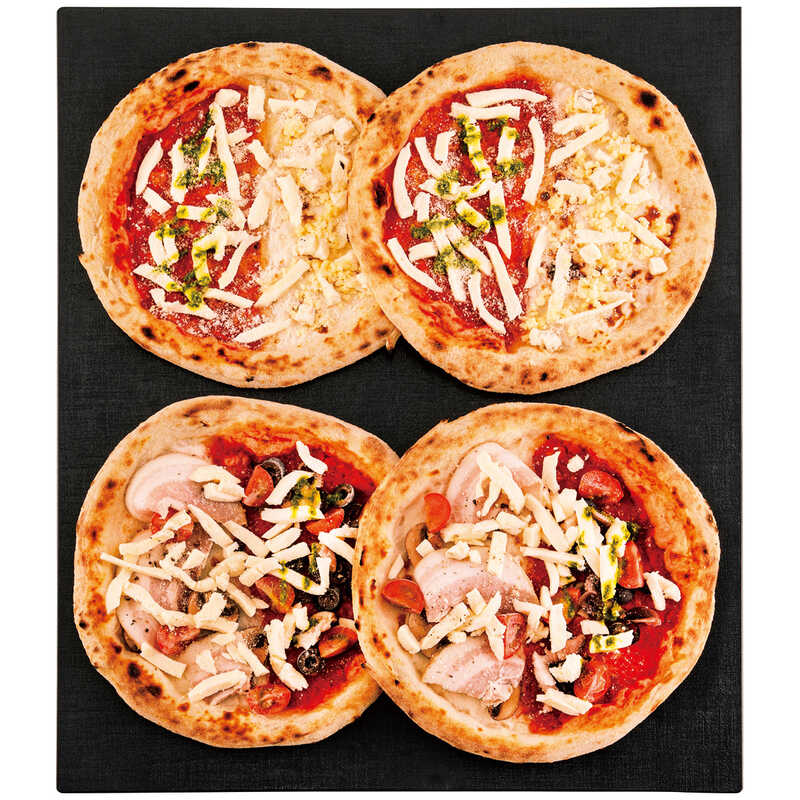シェフこだわりの4種のブレンド小麦粉を用いた釜焼ピザは、オーブントースターで温めるだけで外はサクッ、中はモチモチ。地元の素材をふんだんに使い、1枚で2種類楽しめるハーフ&ハーフで。