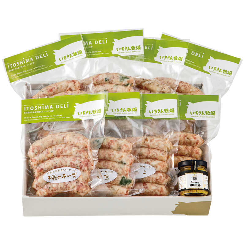 生ソーセージ(ごぼう・きのこ・3種のチーズ・焼ねぎ(各5本入り)(各120g)×各2)、マスタード(45g)×1