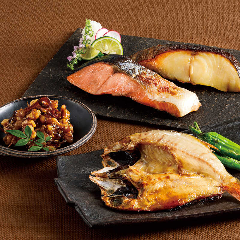 - のどぐろ一夜干・あじ開き・甘口時鮭×各2、鮭塩麹漬・銀だら味噌漬・ちりめんくるみ(60g)、辛子明太子(110g)×各1