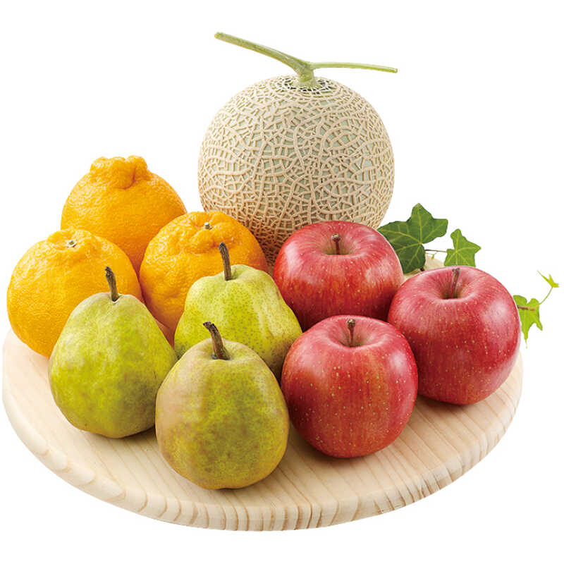 - 高知県産または熊本県産 温室メロン×1玉(1.3kg)、山形県産ラ フランス×3玉(計900g)、青森県産サンふじ×3玉(計750g)、佐賀県産デコポン×3玉(計750g)
