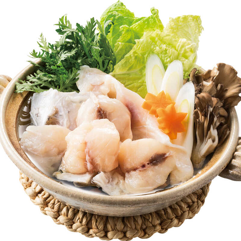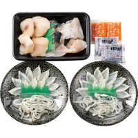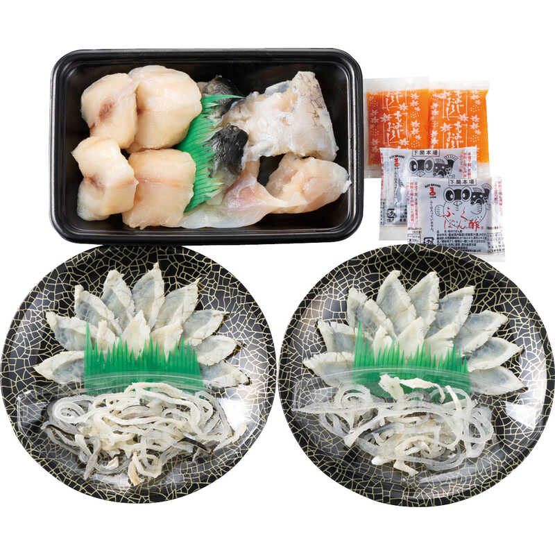 - 真ふぐ霜降り刺身(20g)×2(17cm皿)、とらふぐ皮(20g)×2、ふぐちり(シロサバフグ切身、トラフグアラ)(計200g)、ふくポン酢・もみじおろし(各10g)×各2