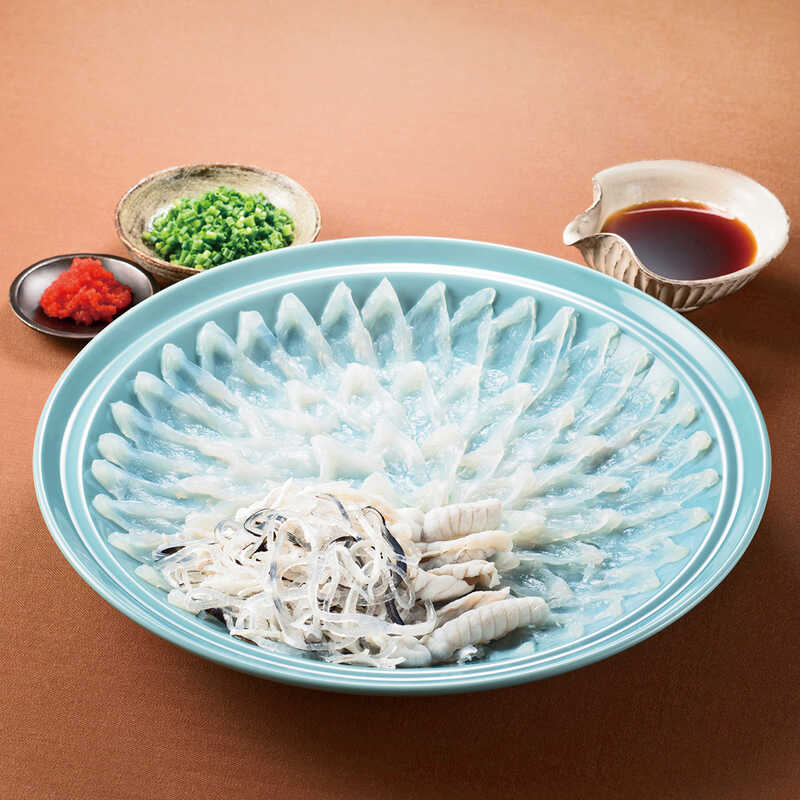 目利きが選んだ高品質のとらふくを、下関伝統の〆工程の後、陶器皿に「菊盛り造り」で盛り付けました。