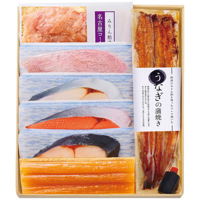 - さわら粕漬・銀だら粕漬・銀しゃけ粕漬・めぬけ粕漬(各60g)・名古屋コーチン粕漬(100g)・守口漬(75g)・うなぎ蒲焼き(1尾 200g)×各1