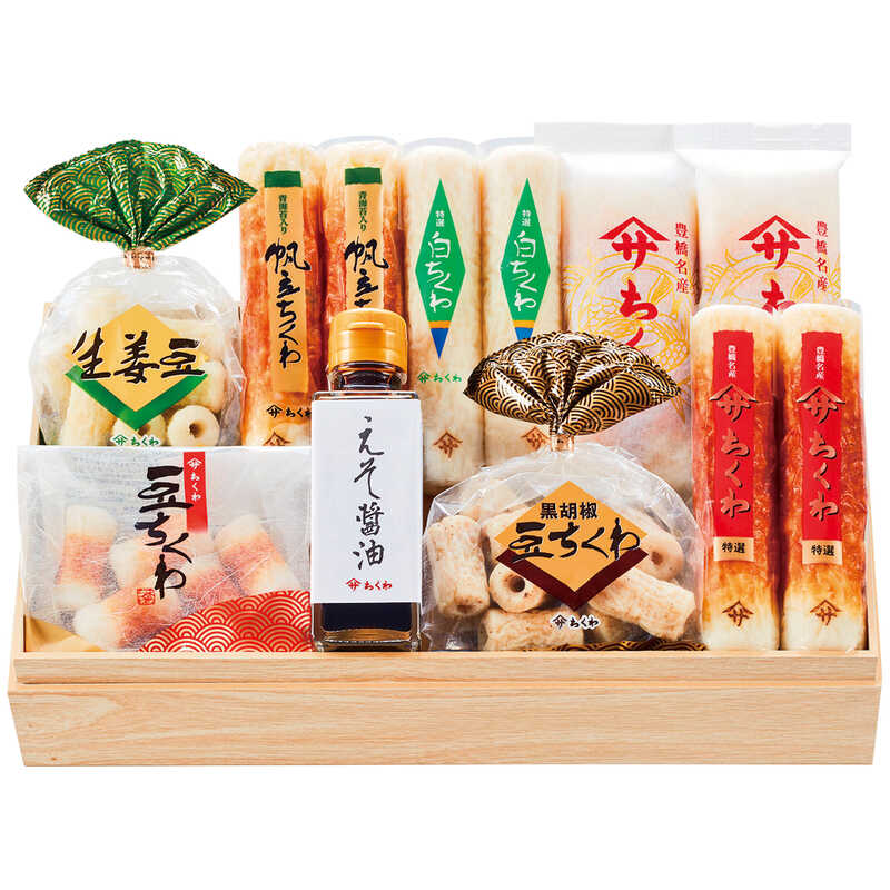 特製ちくわ(2本入)・特選ちくわ・帆立ちくわ・白ちくわ×各2、豆ちくわ(5個入)・黒胡椒豆ちくわ・生姜豆(各10個入)・えそ醤油(100mL)×各1