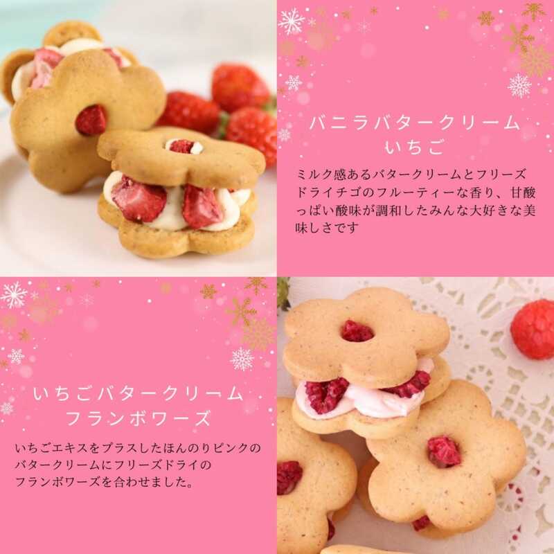 フルリールはフランス語で「花が咲く」です。スイーツで心に花を咲かせて下さい。バター、小麦粉、和三盆糖を使用したサクサクと香ばしいクッキーは丁寧に焼き上げております。可愛らしいいちごとフランボワーズをサンドした蓋を開けると笑顔こぼれるセットです。<バニラバタークリームといちご>ミルク感あふれるバタークリームにフリーズドライのいちごを合わせました。フルーティーな香り、甘酸っぱい酸味が調和した誰にでも愛される味わいに仕上がりました。<いちごバタークリームとフランボワーズ>いちごエキスをプラスしたほんのりピンクのバタークリームにフリーズドライのフランボワーズをあわせました。