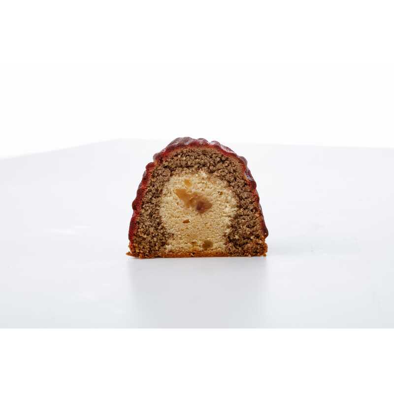 栗と洋梨のコンポートが入ったメイプル風味のアーモンド生地を香ばしいコーヒー生地で包んで焼き上げました。丸太をイメージしたクリスマス伝統菓子ビッシュ・ド・ノエル型の焼菓子です。