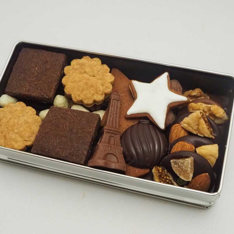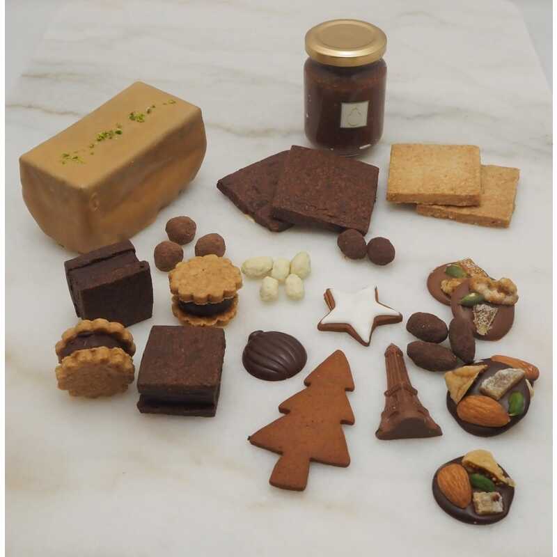 - 冬のクッキーチョコレート缶x1、プレミアム・ガトー・オ・ショコラx1、カカオ・スプレッドx1、ビスケット・プレーン(2枚入り)x1、ビスケット・ダブルカカオ(2枚入り)x1