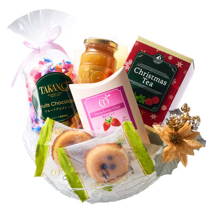 - 果実ジャム150g(オレンジ)、苺のチャイ20g箱、クリスマスティーティーバッグ7入(2.5g×7袋)、フルーツチョコレートSPリボン、果実マドレーヌ(ブルーベリー、りんご)×各1、クリスマスオーナメント付