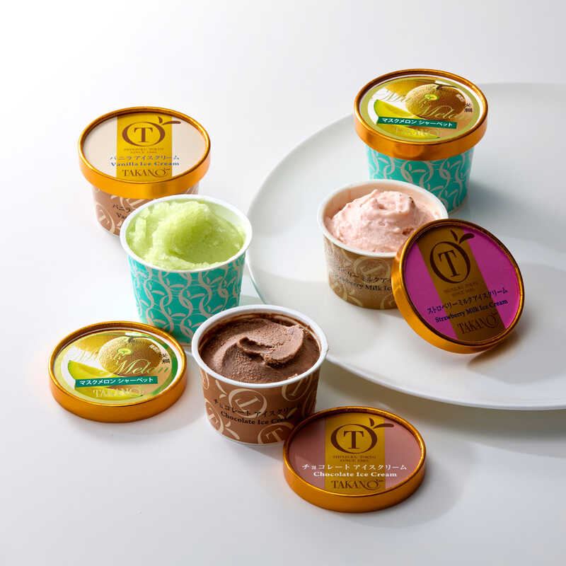 - アイスクリーム100ml(バニラ、チョコレート、ストロベリーミルク×各1)、120mlマスクメロンシャーベット×2