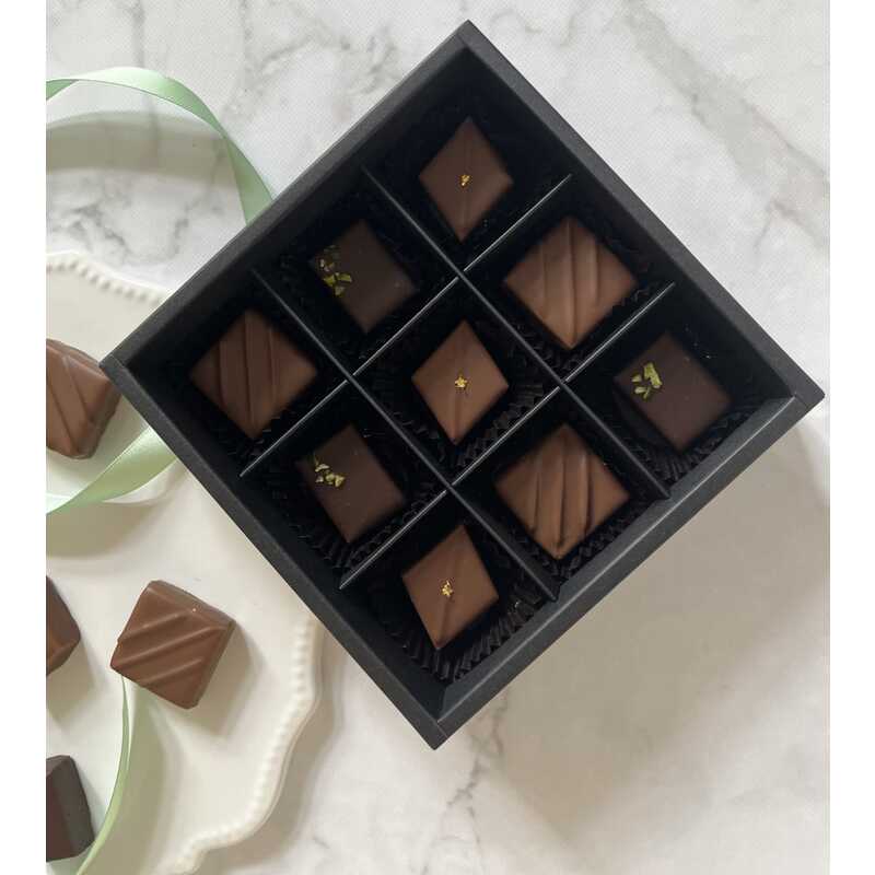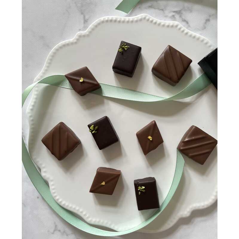 ピスタチオがぎっしり詰まったダークチョコレートの「ピスタチオ」、ベルガモットの香り高いミルクの「アールグレイ」、濃厚なミルクキャラメルをミルクチョコレートで包んだ「キャラメル」。甘さ控えめで上品な口当たりに仕上げました。