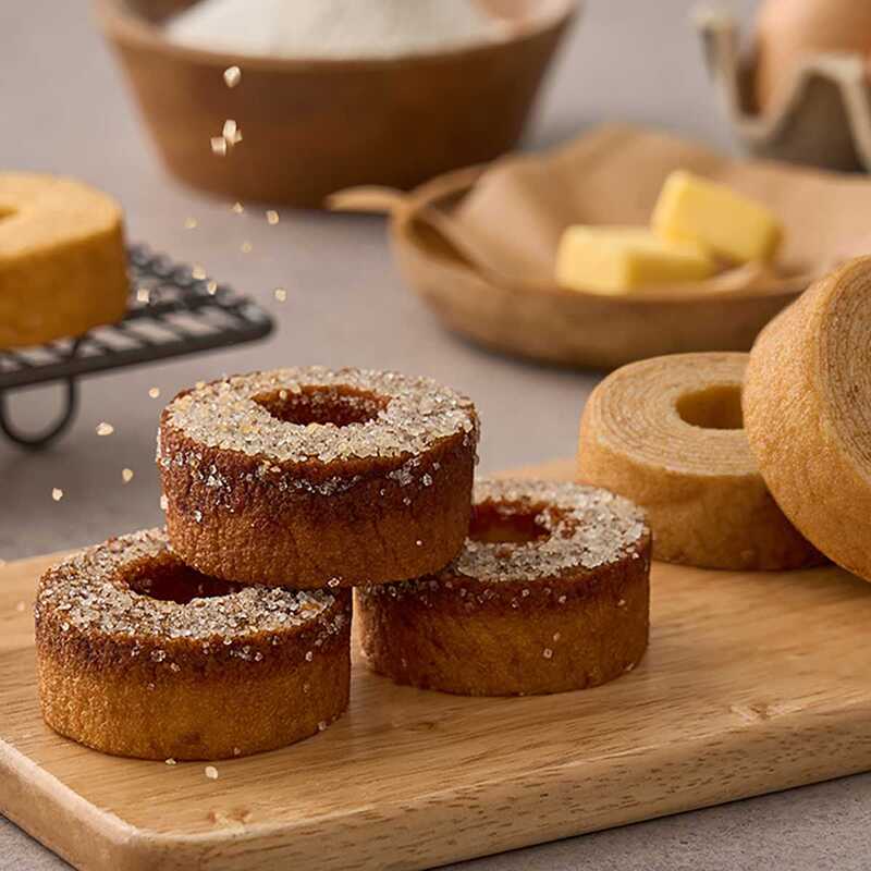 北海道で製造された発酵バター、アーモンドプードルを使用した、コクと芳醇な香りの発酵バターバームクーヘンと、大粒のざらめを焦がしたジャリジャリとした食感が楽しいブリュレバームクーヘン。異なる魅力を持つ2種類のホテルオークラのバームクーヘンを、ぜひお楽しみください。