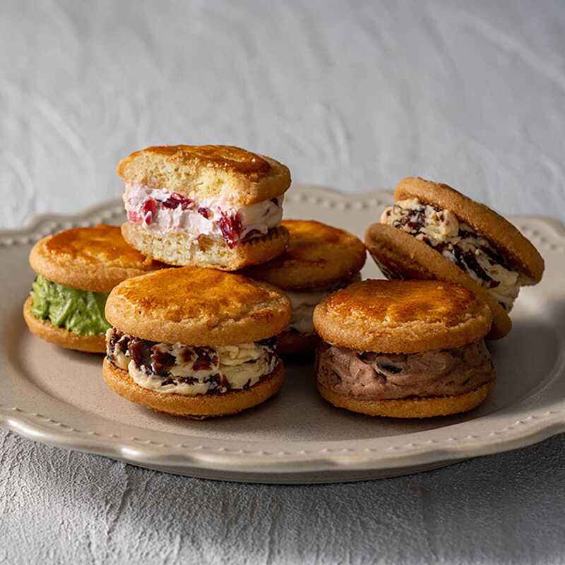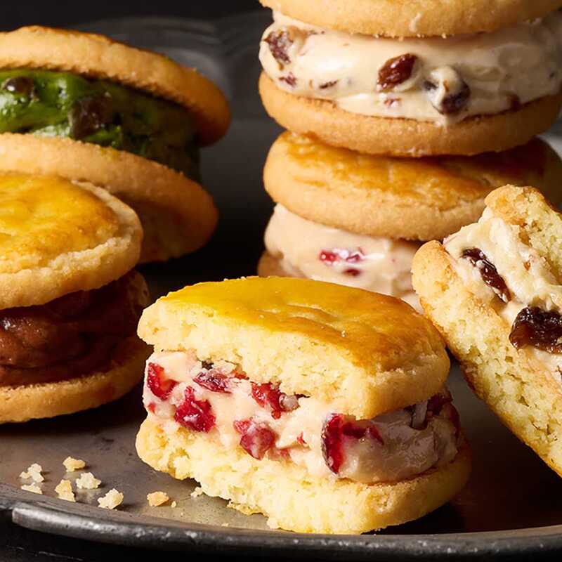 酸味のあるドライフルーツたちがほどよくマッチする、発酵バターを使用した濃厚なバタークリームを、ちょっぴり塩気のあるサクサクなクッキーでサンドしました。バタークリームの濃厚さ、ドライフルーツの量や大きさ、クッキーの食感や厚み、塩気など、パティシエのこだわりを詰め込んだ自慢のレシピで作るバターサンドです。