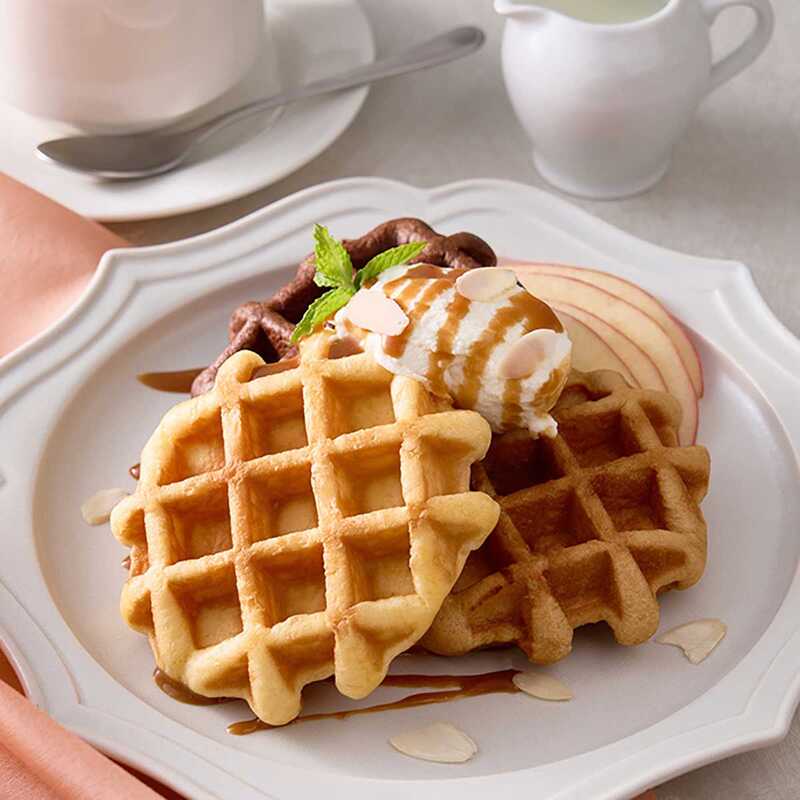 本場ベルギーの製法を参考にしながらも、日本人の好みに合わせた独自のアレンジを加えています。「しっとり」「やわらかい」食感に特にこだわり、老若男女問わず幅広く親しまれるワッフルに仕上げました。アイスや生クリームを添えてアレンジを加えることで、よりおいしくお召し上がりいただけます。