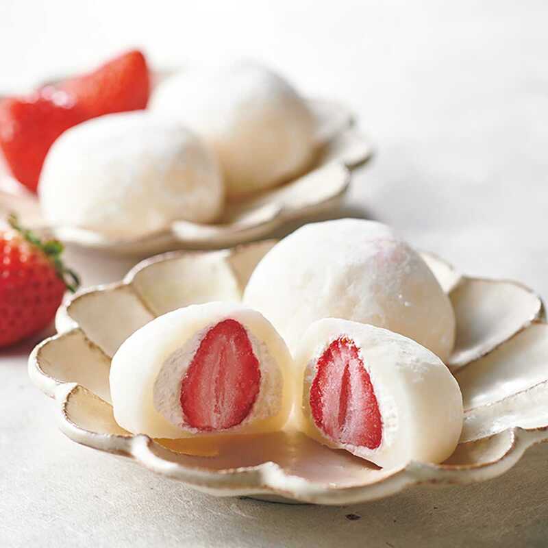もち粉とうるち粉をブレンドしたやわらかく伸びのある大福で、ホイップクリームと福岡県産あまおうを1粒包み込みました。やわらかいお餅の食感といちごの酸味、やさしい甘さのクリームが1つになった味わいのバランスをお楽しみください。