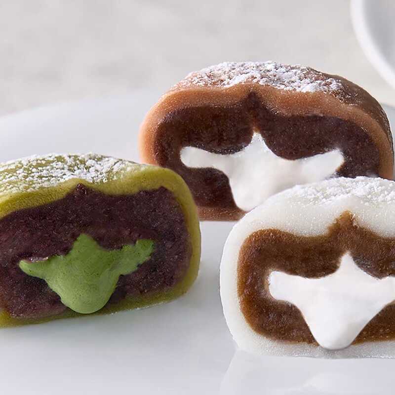 加熱方法にこだわり、香り高く仕上げたコーヒー餡を使ったカフェオレ大福、福岡の八女茶をもち生地、クリームに使用した抹茶クリーム大福、オランダのデザーン社の香り高いココアを使用したショコラクリーム大福をセットしました。ホイップクリームはあえて柔らかく仕上げており、口の中でとろけます。