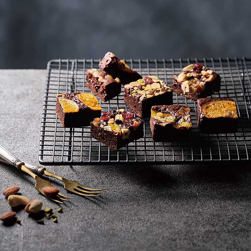 濃厚なチョコレートの生地に、香ばしいナッツや甘酸っぱいフルーツをトッピング。ピスタチオとアーモンド、ごろっとしたパイナップルやネーブル、たっぷりのドライフルーツとナッツ…。おいしさをぎゅっと詰め込んだキューブが、お口に小さなしあわせをお届けします。