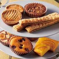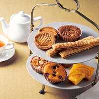 しっとり生地にフルーツやナッツを飾ったプチケーキやオレンジケーキ、さくっとした食感の中にキャラメルの風味が香る少し長いサイズのロングパイ、アーモンドが香ばしく香るフランス伝統の厚焼きクッキーと、ホテルの豊かなティータイムを演出するスイーツを詰め合わせました。