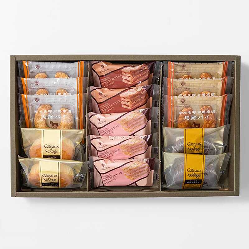 丁寧に折り重ねて焼き上げたミルフイユはパイのサクッとした食感と、とろけるクリームが織りなす贅沢なひととき。スフレは「ふくれる」の意味を持つフランス銘菓。その名の通り柔らかな食感が堪能できます。幸せを受け止め満たしてくれる縁起物として伝承されている馬蹄(ばてい)。そのU字型の馬蹄形をモチーフに作られた幸せを繋ぐ馬蹄パイの詰合せです。