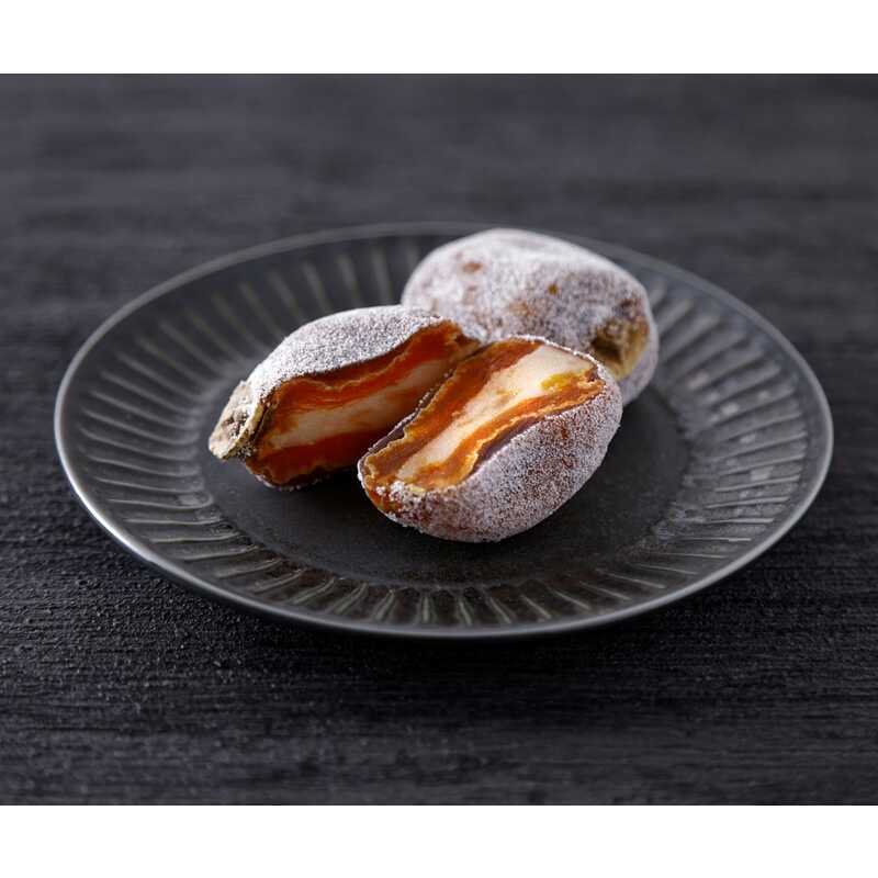 南信州の特産品、【市田柿】を使用しました。鮮やかなあめ色の果肉で、もっちりとした食感と上品な甘味が特徴の柿です。素材そのものの自然の恵みがギュッと詰まった【市田柿】に上品な甘さと香りの柚子餡を挟み、なめらかな羊羹でやさしく包み込みました。