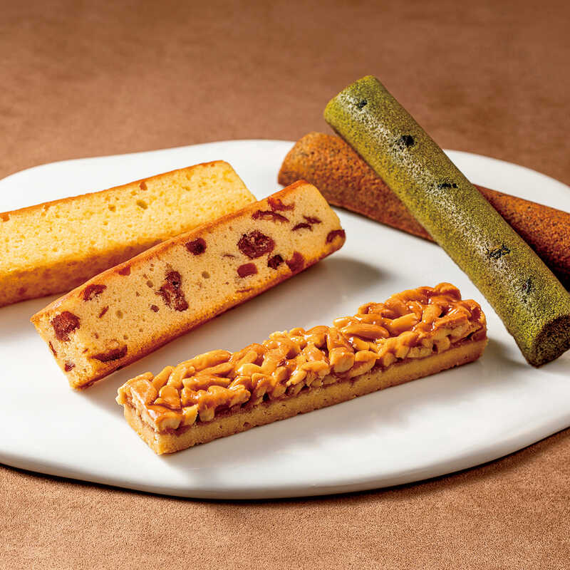 - フロランタン×1、バトン(プレーン・メイプル黒糖・アールグレイ・抹茶と黒豆・チョコレート×各1)、パウンドバトン(晩柑・クランベリー・キャラメルとリンゴ・イチジク×各1)