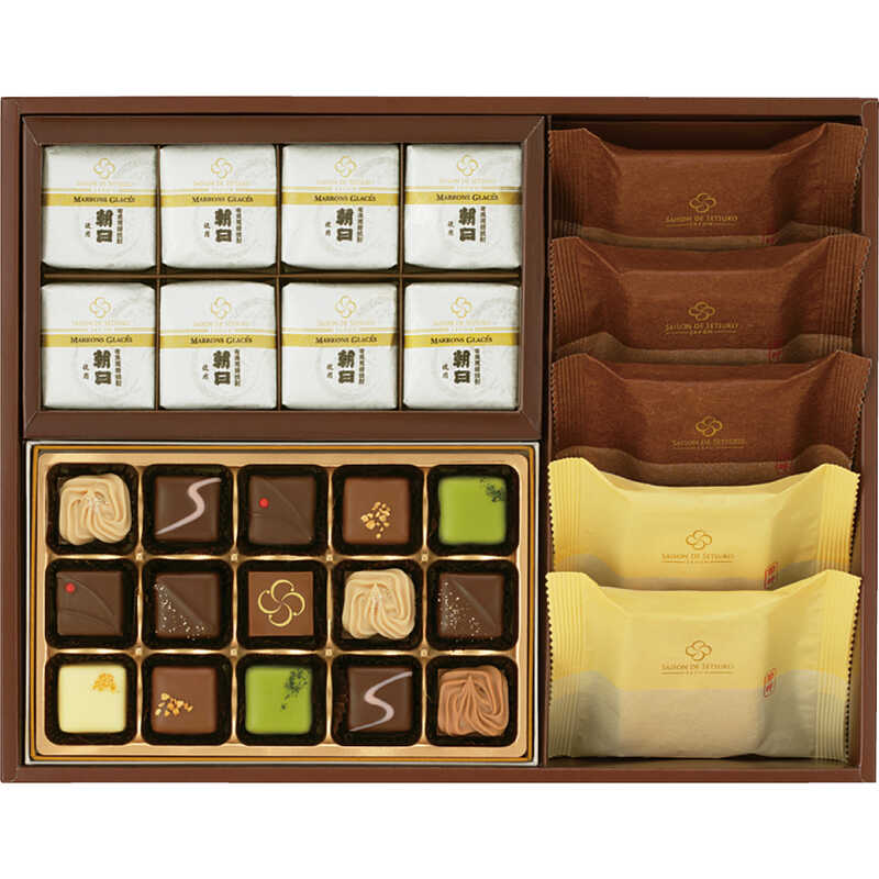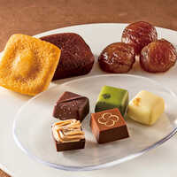 - ショコラの調べ(チョコレート15粒入り)×1、黒糖焼酎のマロングラッセ×8、節呼の焼き菓子(2種 計5)