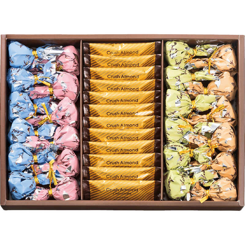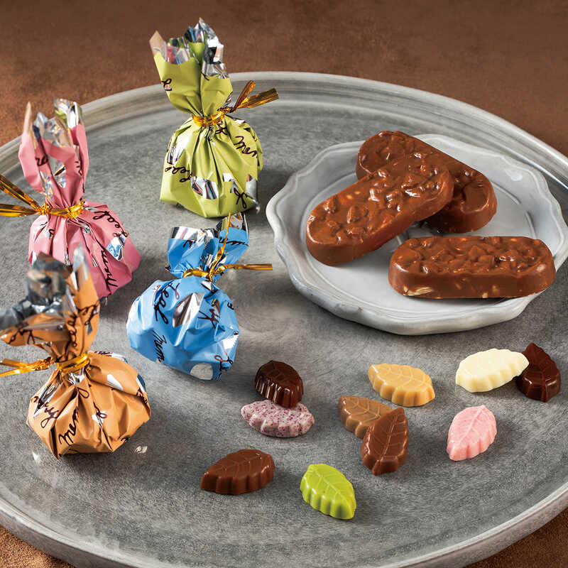 木の葉の形のチョコレート「リーフメモリー」と、細かく刻んだアーモンドにミルクチョコレートを絡めた「クラッシュアーモンド」の詰め合わせです。
