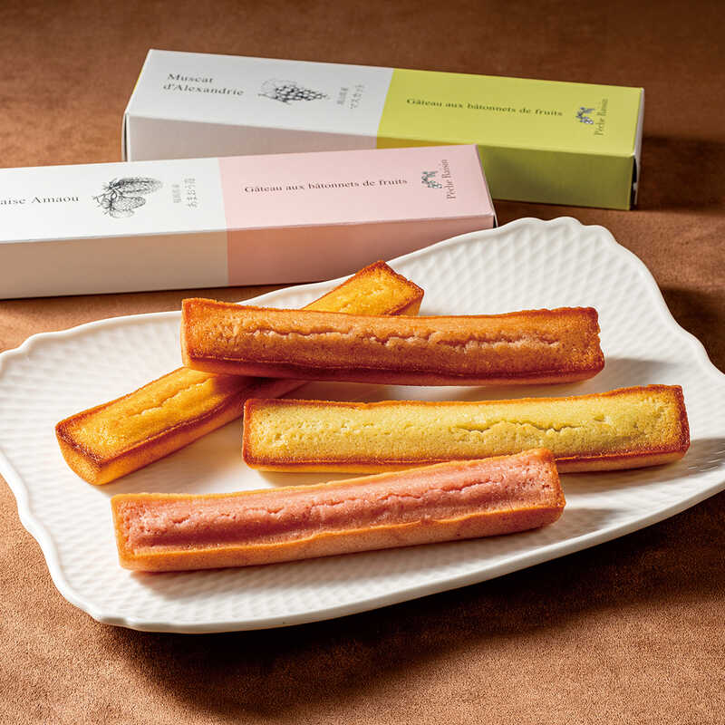 清水白桃、あまおうなど国産フルーツの果汁やピューレを使用し、しっとり焼きあげたフィナンシェを食べやすいスティック状に。