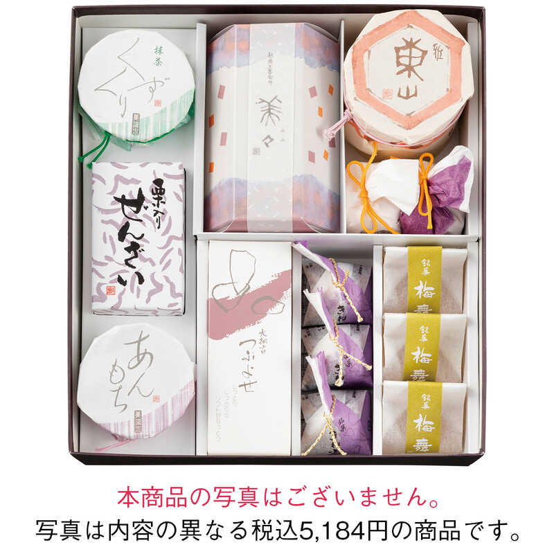 - 美々(7枚)・東山(12個)・懐中志るこ和三盆・久寿湯・つぶよせ(2袋)×各1、きね小倉・梅舞×各3
