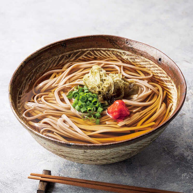 そばの実と甘皮をすべて挽いた「挽きぐるみ」の粉をすばやく製麺し、香り高く舌触りと歯切れのいい十割そばに。奥出雲の老舗が磨きあげた「本物の味わい」で年越しを。