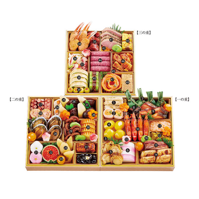 ※諸事情により献立内容、品目数、重箱サイズ、材質が多少変更になる場合もございます。あらかじめご了承ください。