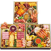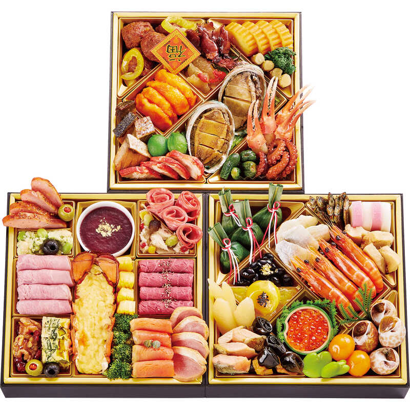 和・洋・中華、それぞれの魅力が見事に調和した三段重。錦のように彩り豊かな食材が、新年にふさわしい祝宴を演出します。