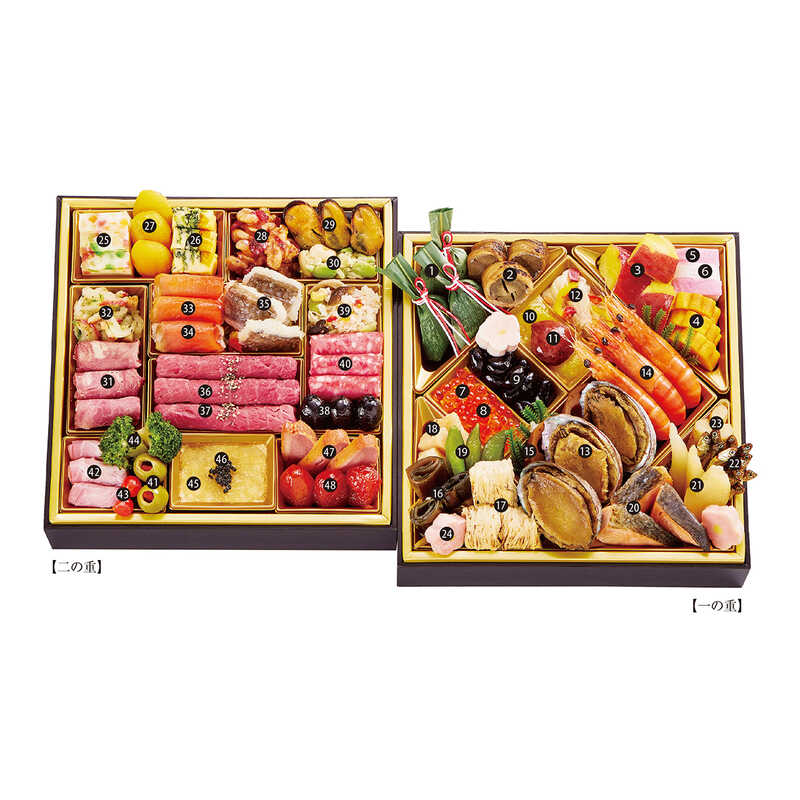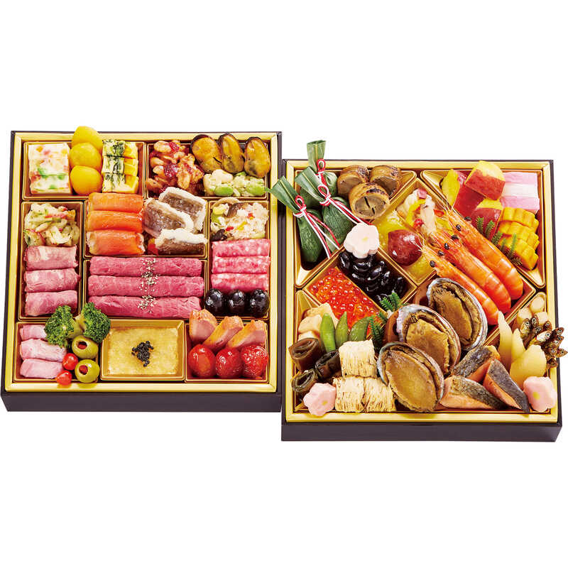 和の伝統と、洋のエッセンスを合わせた豪華な二段重。神戸牛リエットやローストビーフなど高級食材もふんだんに。