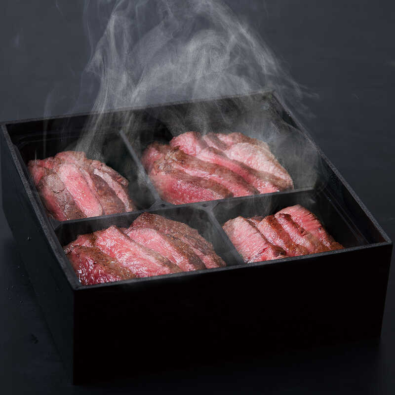 肉職人が選び抜いた近江牛の希少な部位をステーキで堪能。温められる容器でお届けします。