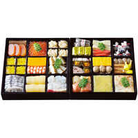 ご贈答にも最適なお一人様おせちと、日本の珍味、ご馳走を揃えた贅沢重。食べやすさを考え、深さを調整し、美しく九つの枡を設け創意工夫をしております。日本の伝統の味を伝えながら、皆様の団欒の時が豊かでありますよう願いを込めました新年の食卓を彩るおせちです。
