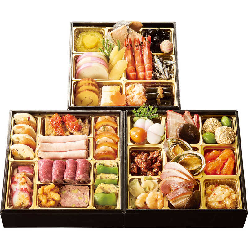 〈花しょうぶ〉の和の重、銀座〈ポルトファーロ〉の洋風オードブル、銀座〈花蝶〉の中華料理を一段ずつ。