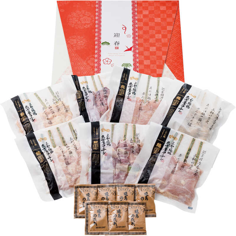 名古屋コーチン串(ももねぎま・むね・皮・砂肝・ささみ・ぼんじり×各4)、名古屋コーチン入りつくね串×4、焼き鳥のたれ×7