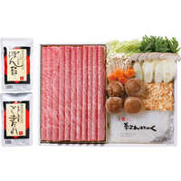 松阪牛ロース肉400g、白菜130g、白葱80g、春菊30g、エリンギ4枚、椎茸4個、花形人参4個、えのき茸70g、焼き豆腐150g、糸こんにゃく200g、ぽん酢170g、ごまだれ170g