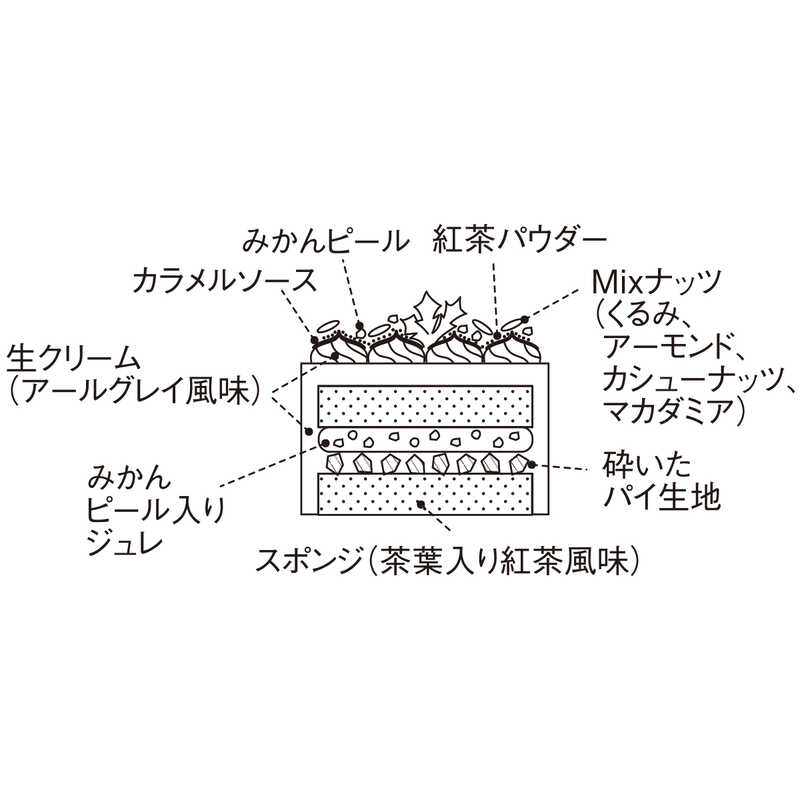アールグレイ風味の生クリームで茶葉入り生地を包んだ香り豊かなクリスマスケーキ。たっぷりのローストナッツやオレンジピール、紅茶パウダーでデコレーション。香ばしくも華やかな味わいが広がります。