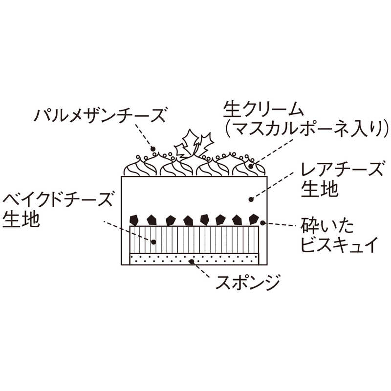 華やかにチーズクリームを絞り、マスカルポーネ、クリームチーズ、パルメザンの3種のチーズをバランスよく組み合わせました。濃厚で奥行きのあるチーズケーキは、チーズスイーツ専門店ならでは。
