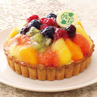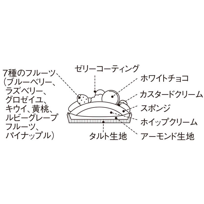 いろとりどりのフルーツを使った華やかなタルトケーキです。アーモンド生地のタルトに2種のクリームとスポンジを重ね、7種のフルーツを盛り付けました。