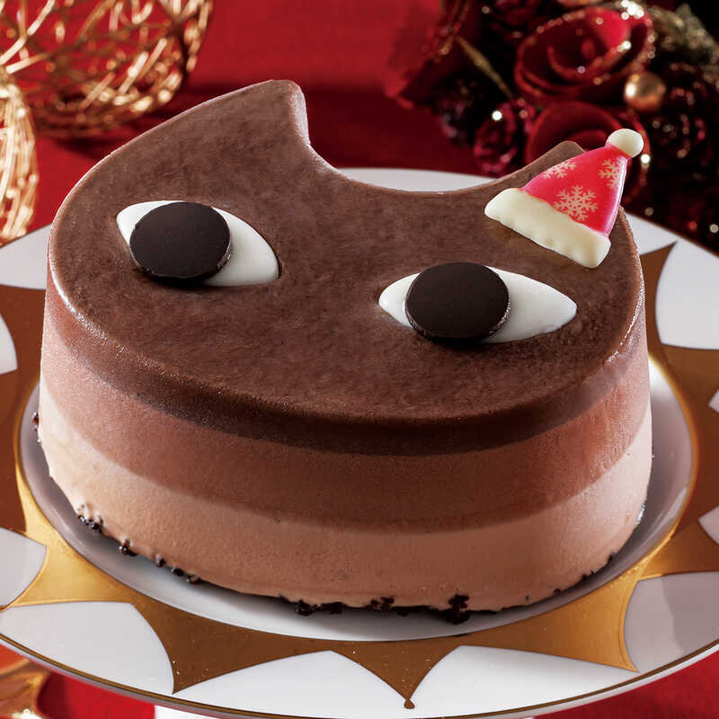 遊び心あふれるネコのかたちのアイスケーキ。ビターとミルクの2層のチョコアイスに、食感が楽しめる削りチョコを忍ばせました。ネコ好きの方への特別なクリスマスに、ぜひ。