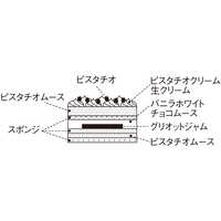 ムースとクリーム、それぞれに2種類のピスタチオペーストを贅沢に使用。まろやかなバニラホワイトチョコムースとミルキーな生クリーム、甘酸っぱいグリオットジャムが、ピスタチオと甘美なハーモニーを奏でます。