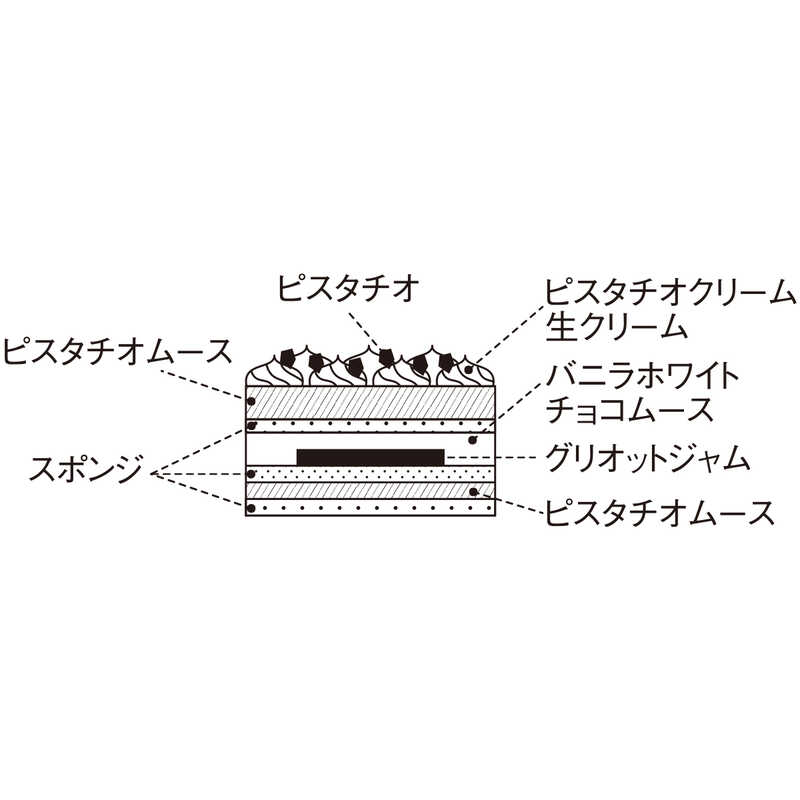 ムースとクリーム、それぞれに2種類のピスタチオペーストを贅沢に使用。まろやかなバニラホワイトチョコムースとミルキーな生クリーム、甘酸っぱいグリオットジャムが、ピスタチオと甘美なハーモニーを奏でます。