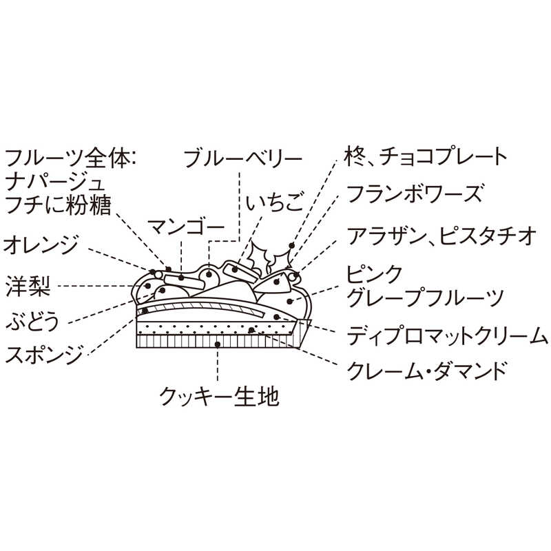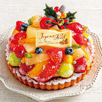 サクサクのアーモンドタルトにカスタードクリームを重ね、オレンジ、ぶどう、マンゴー、ブルーベリー、洋梨など8種のフルーツを彩りよく盛り込んで。贅沢なクリスマスの限定タルトです。
